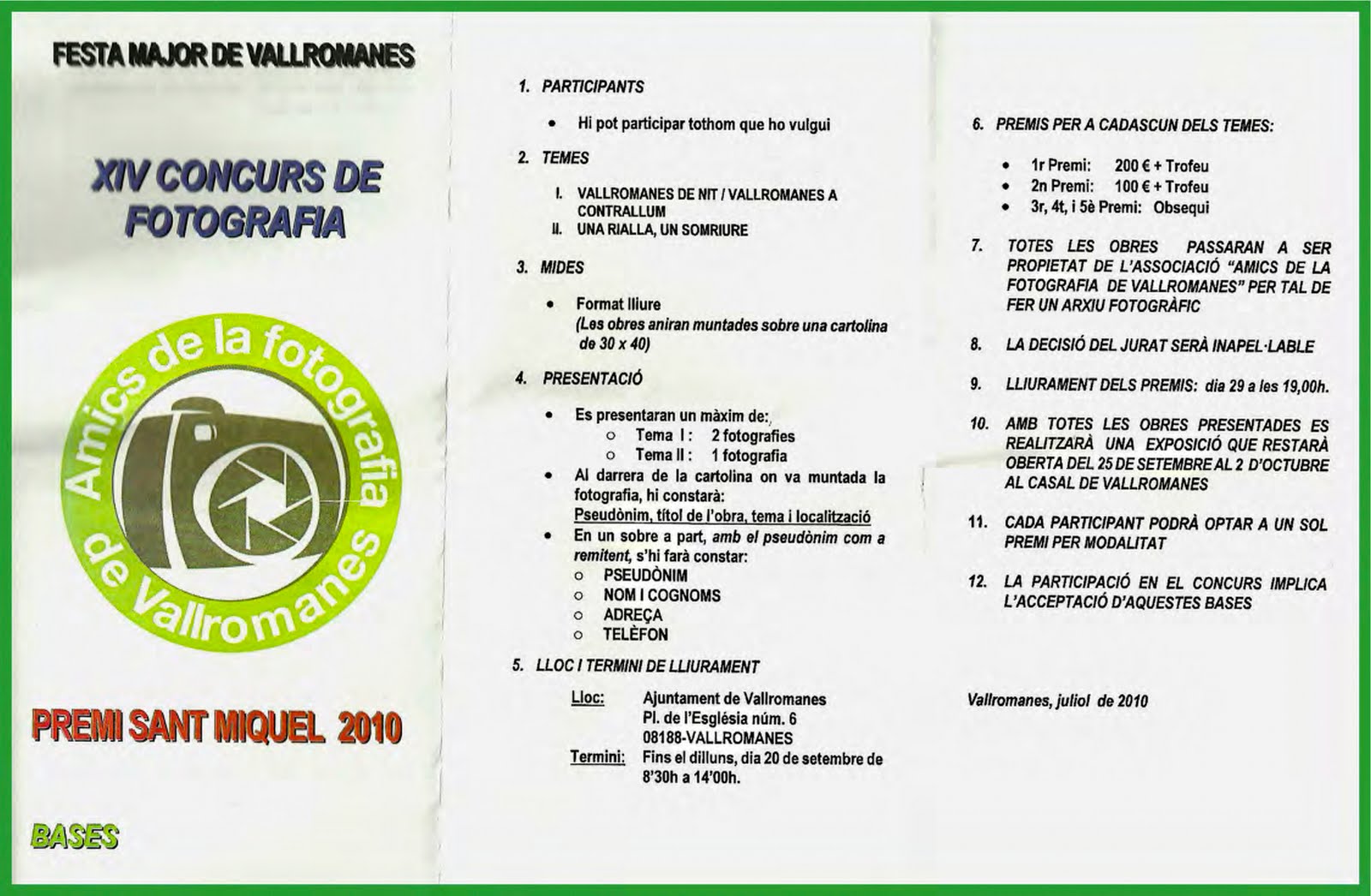 Us recordem que el proper dia 20 de setembre s'acaba el termini per presentar les vostres fotografies al XIV Premi de Fotografia de Vallromanes Sant Miquel 2010.